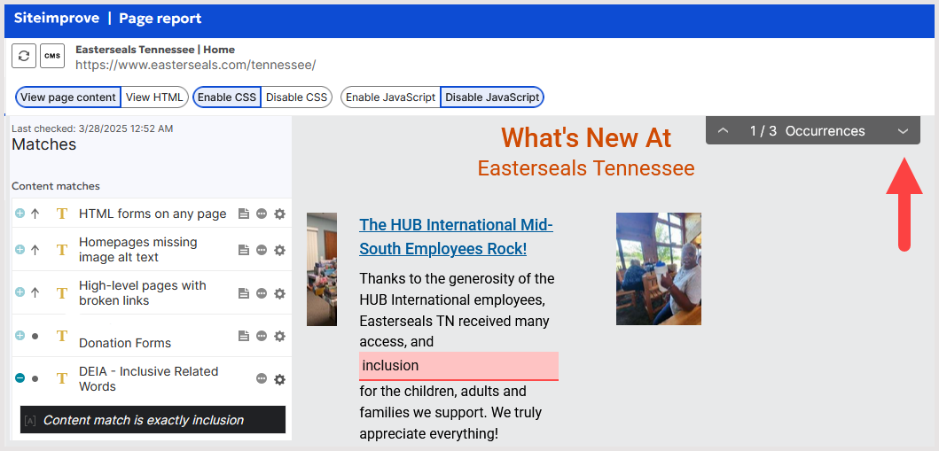 - From the Page Report that opens, a word match will be highlighted in red to display where on the page that specific match appears